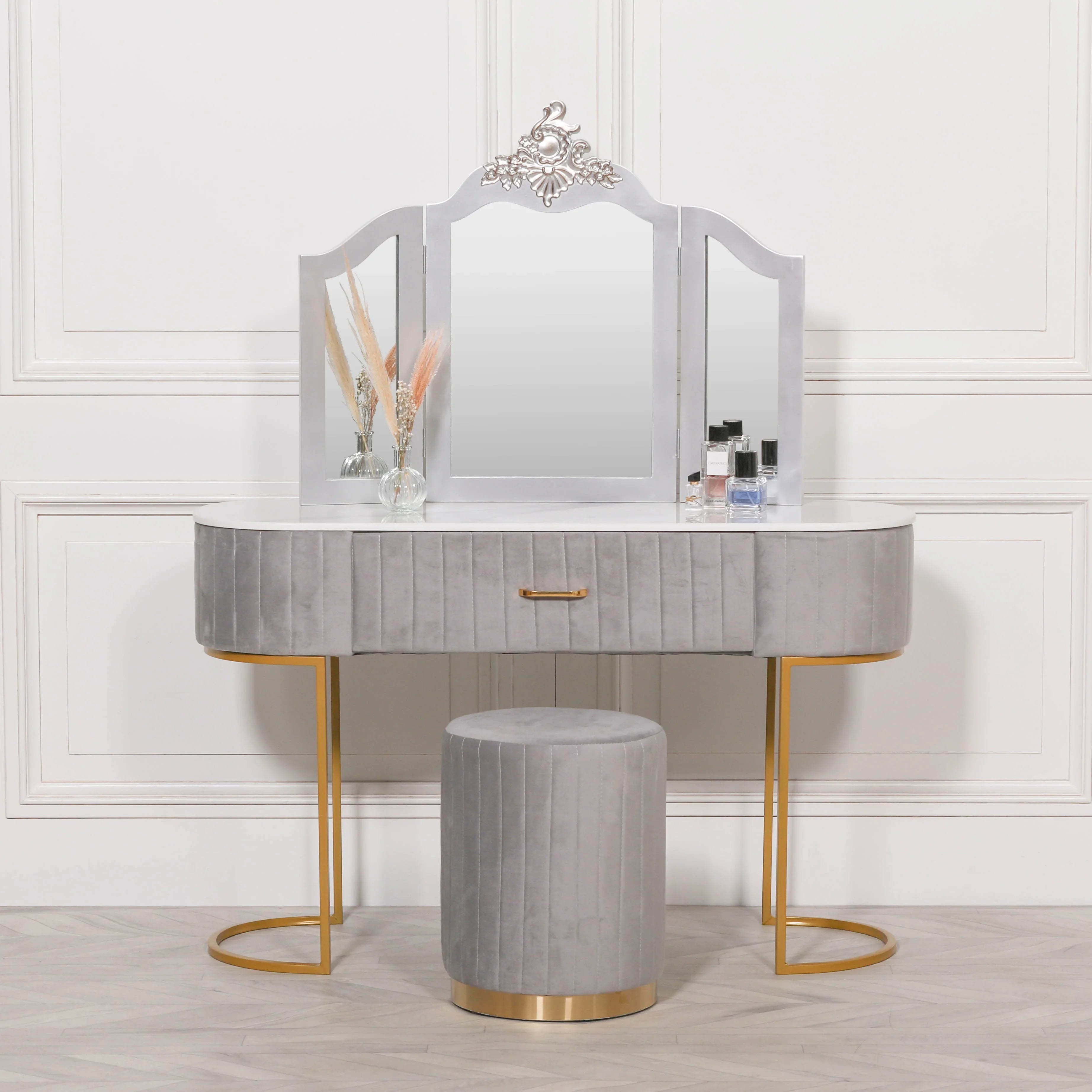 This French Antique Silver Vanity Mirror exudes elegance with its intricate motif detailing and silver finish. Featuring three mirror-folding compartments, it adds a touch of vintage charm to any dressing area.