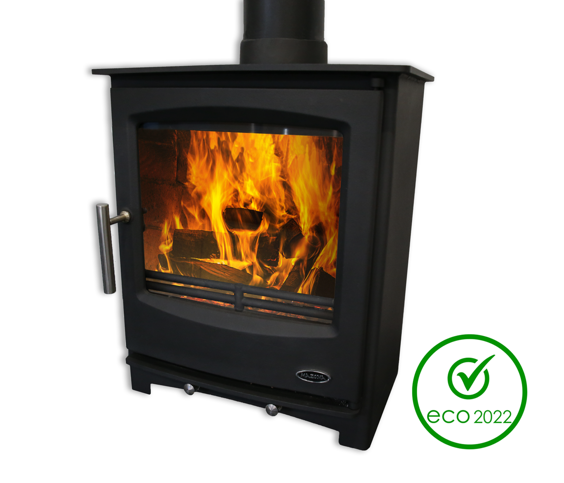 Mazona Newport Eco Stove 7kw F/S is a robust steel stove featuring a cast iron door, designed for efficient heating with a Direct Air outlet.