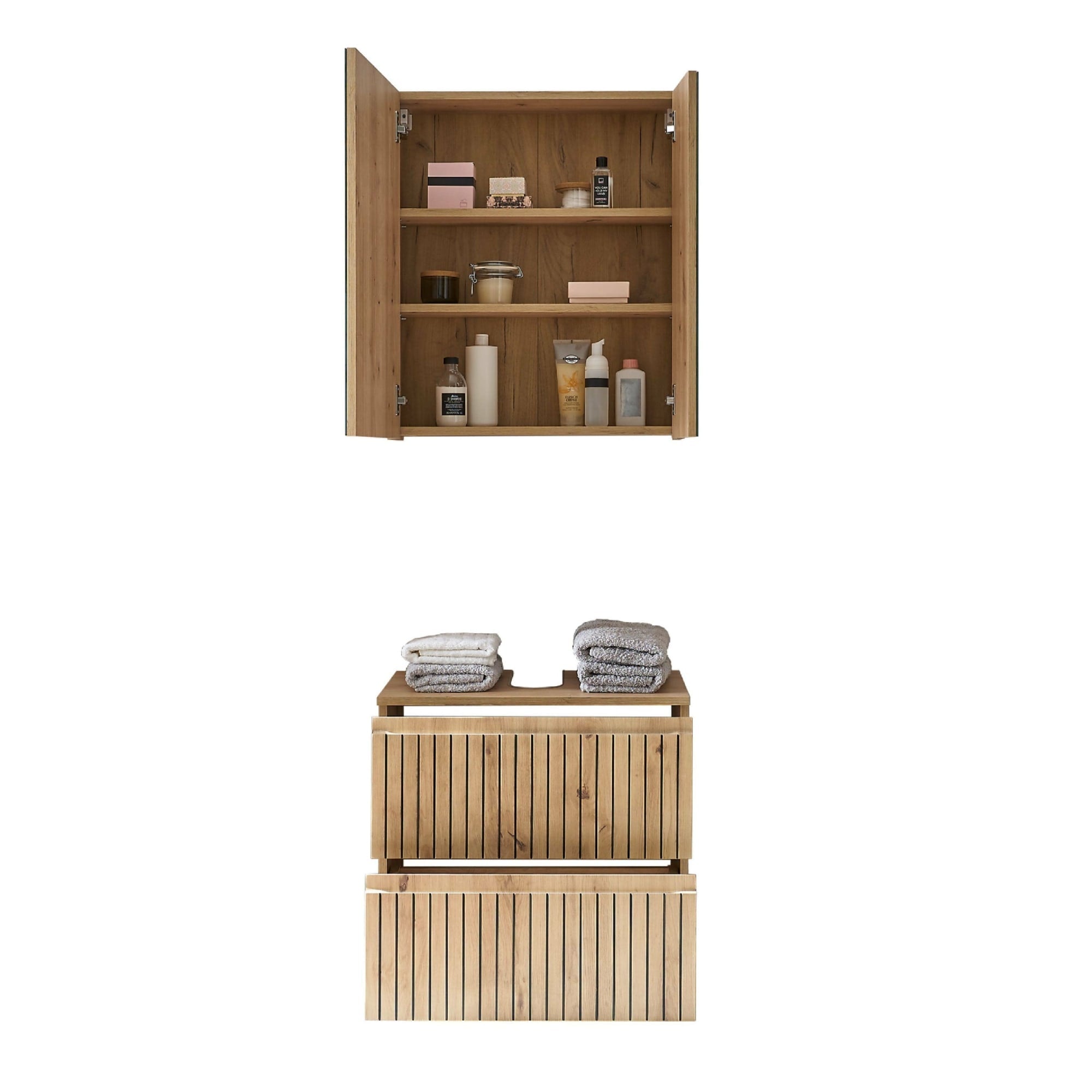 - Double-shelf design provides ample storage space for essentials while keeping them out of sight, ensuring a clean, organised bathroom.