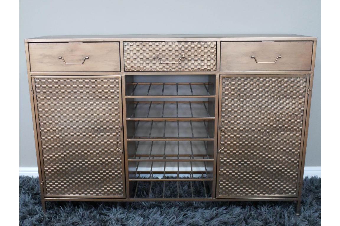 This Wine Sideboard exudes elegance and sophistication with its stunning copper finish that adds a touch of luxury to any room. The sleek design features clean lines and a contemporary aesthetic, making it a versatile piece that complements both modern and traditional interiors. The sideboard's rich colour and metallic sheen create a striking focal point, perfect for showcasing your wine collection or serving drinks during gatherings.
