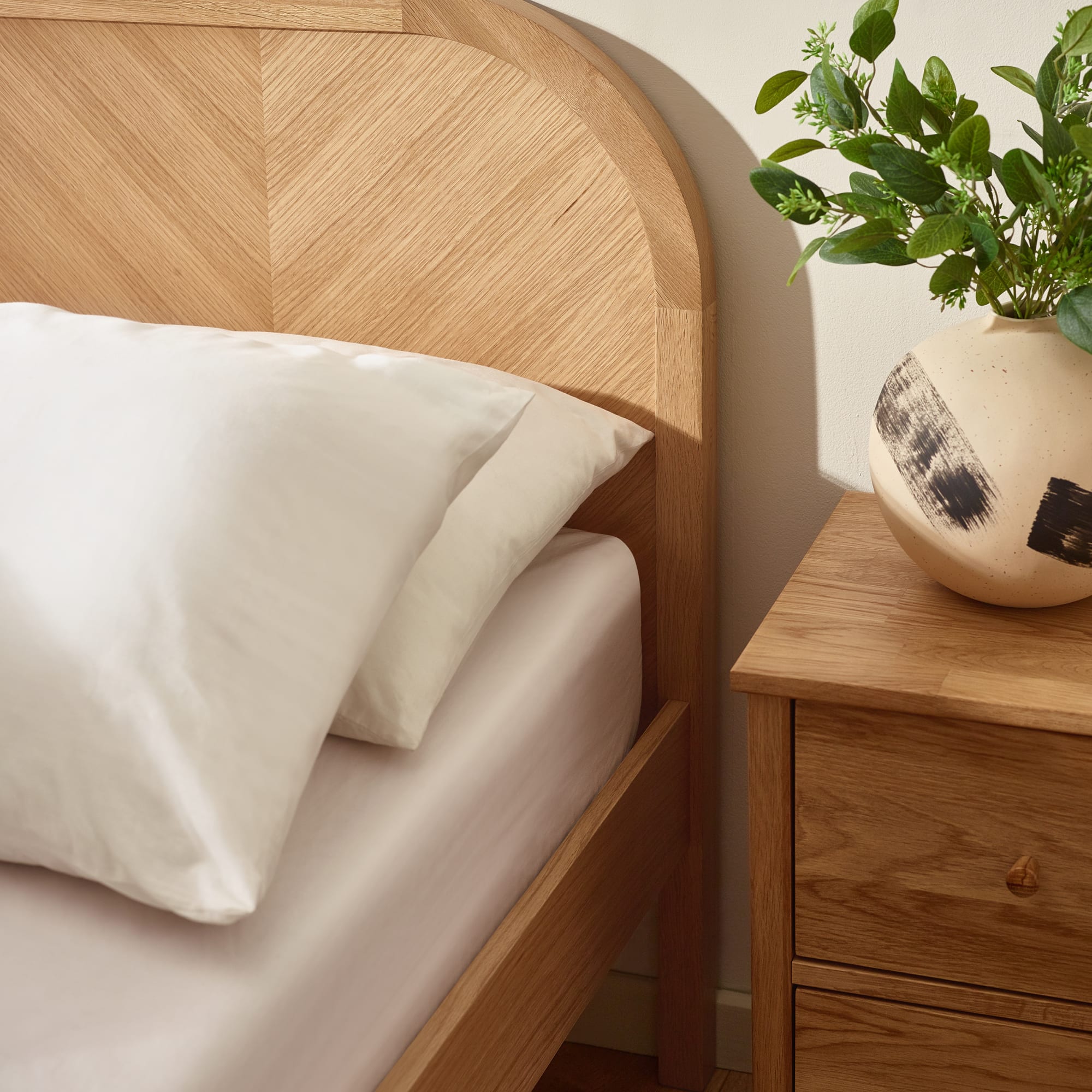 Make your bedroom a statement space with this 135cm oak chevron bed. Its headboard and footboard feature a bold chevron design that adds depth and character, while softly rounded corners keep the look inviting. Made from solid oak, the frame highlights the natural grain of the wood, giving warmth and long-lasting quality. The legs offer solid support and a clean, timeless finish, and the slatted base keeps your mattress properly supported. Minimal assembly required. Mattress sold separately.