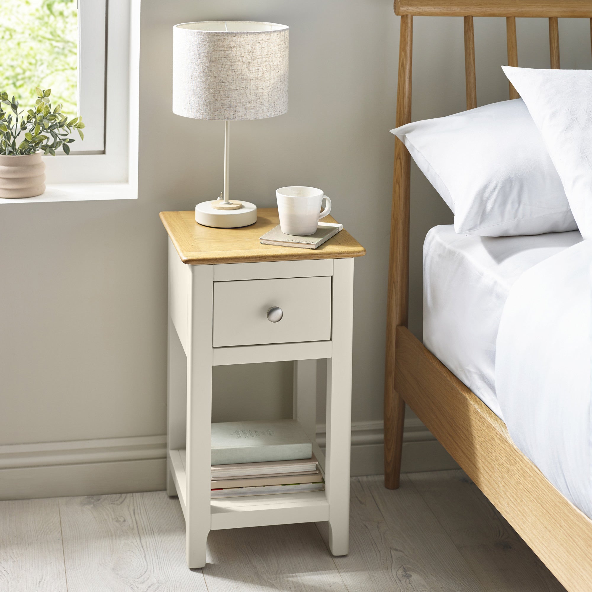 Keep your bedroom calm, tidy, and beautifully organised with this Compact 1 Drawer Bedside Table in oak. Designed to fit neatly beside your bed without taking up unnecessary space, this bedside table combines classic style with practical everyday storage. With one smooth drawer and a shelf below, it's perfect for keeping all your essentials close at hand-chargers, books, skincare and night time must-haves-while keeping your tabletop clear and clutter-free.