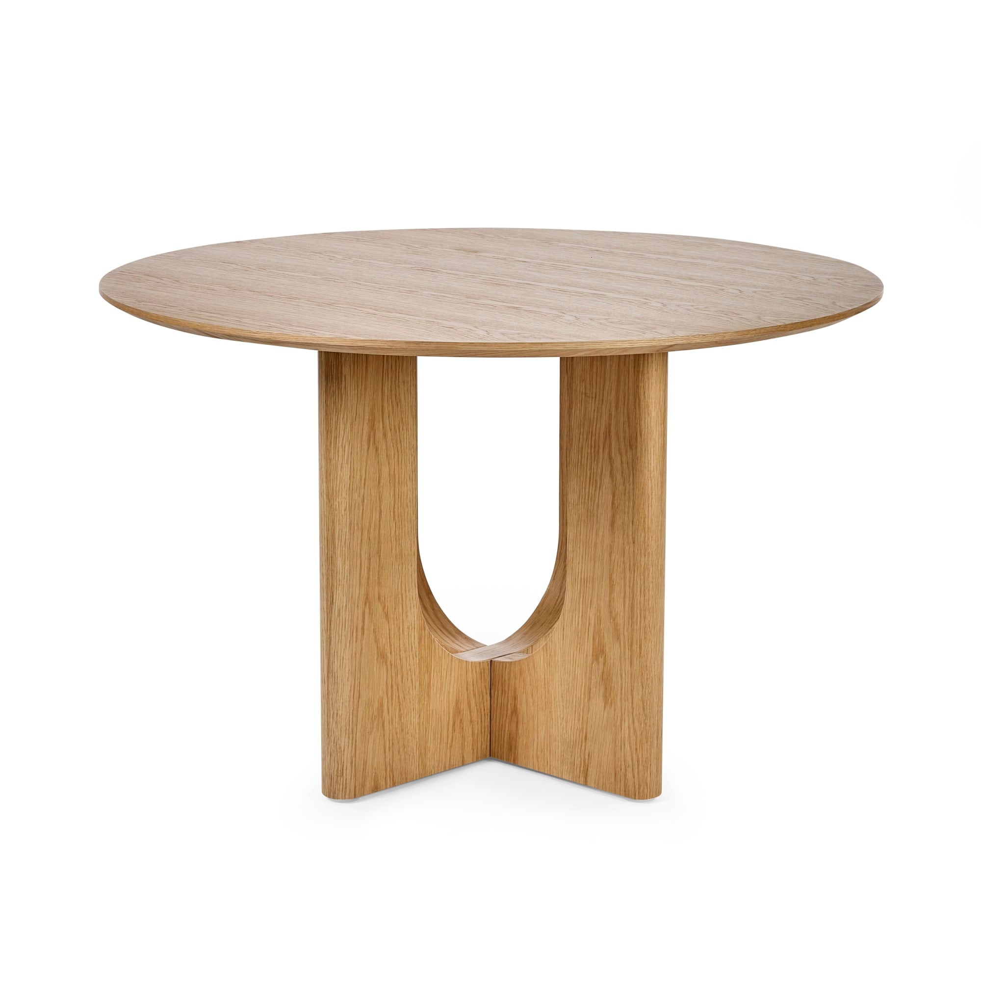 Bring sculptural elegance to your dining space with the Cellini Round Dining Table in oak. The smooth, natural oak-effect top rests on a distinctive four-legged intersecting base with subtle curved detailing, creating a striking and balanced look. Its organic tone and tactile texture bring warmth to modern interiors, making it a perfect fit for any dining room or kitchen table setting. Ideal for relaxed meals or stylish gatherings, this dining room table seats up to four people. Minimal assembly required. Chairs sold separately.