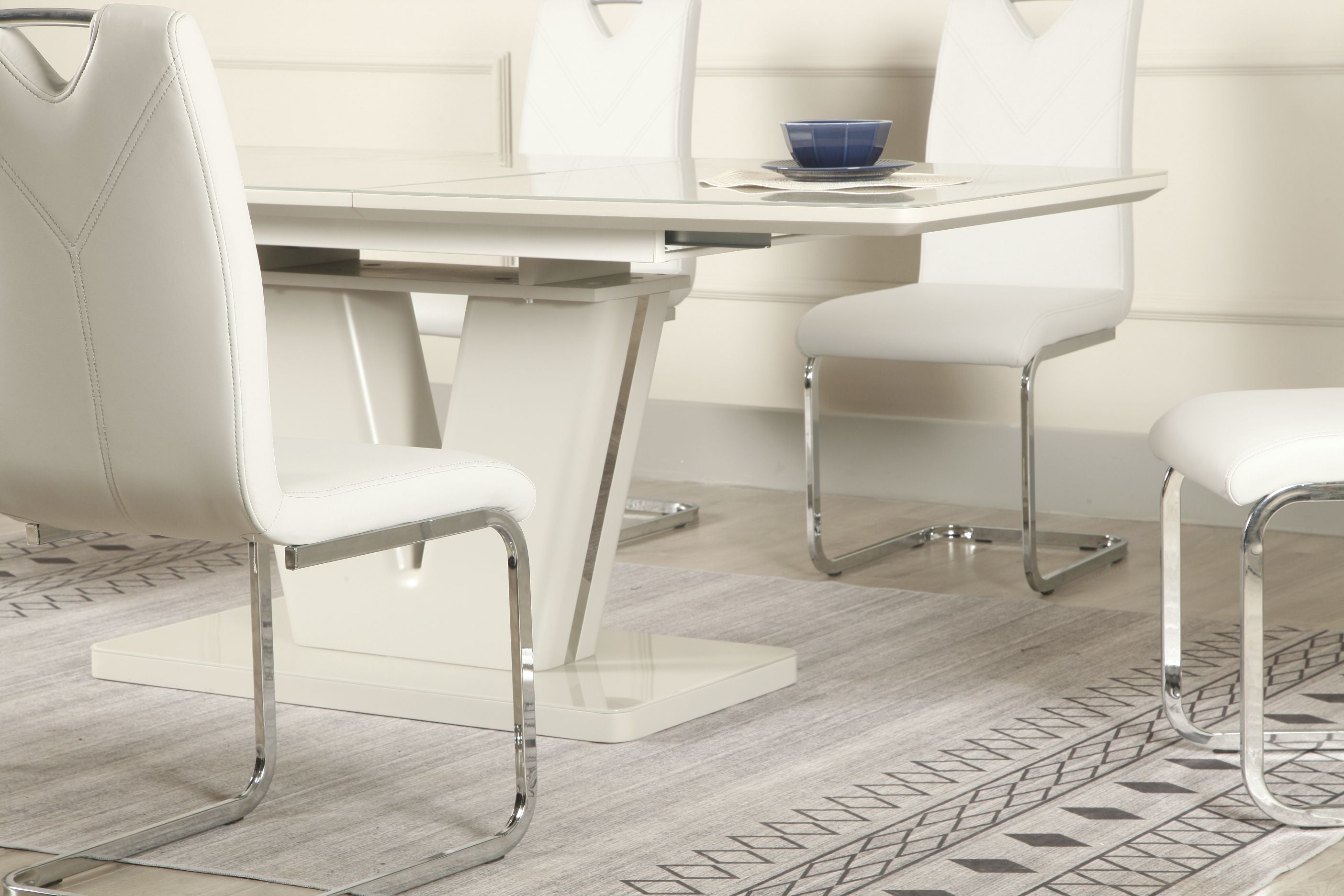 This stylish Vicenza Extension Table in light grey is the perfect addition to your dining room or any occasional space. Paired beautifully with Vicenza Chairs, it exudes elegance and charm, elevating the ambiance of your home.
