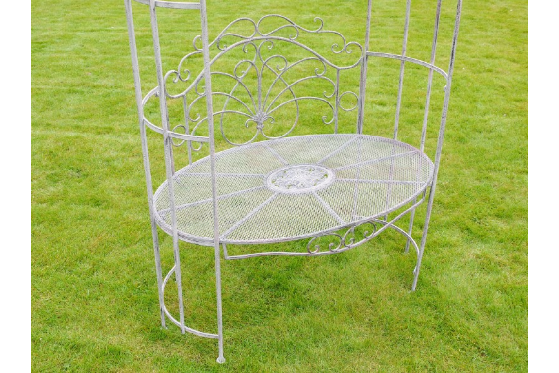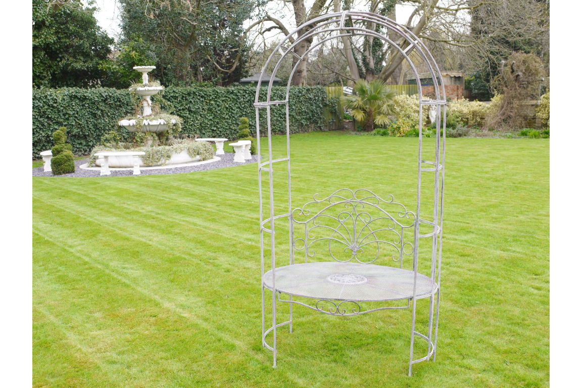 Crafted from durable metal with an antique grey finish, this arch and seat set is not only stylish but also practical. The weather-resistant material ensures longevity, but it is recommended to protect this item from changing weather conditions to maintain its beauty over time. Whether used as a focal point in a lush garden or as a quiet retreat in a courtyard, this Antique Grey Arch & Seat offers both style and functionality.