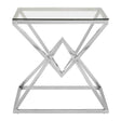 Crafted with a sleek silver finish stainless steel frame, this end table features a square clear glass top that exudes elegance. The sculptural base showcases a unique interlocking pyramid design, creating a visually striking diamond center. Add a touch of sophistication and modern flair to your living space with this stylish and functional piece.