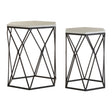 Elevate your space with this exquisite set of two hexagonal side tables featuring a sleek white marble top resting elegantly on a modern open-frame base. Crafted with precision and artistry, these tables boast clean lines that enhance their minimalist design, creating a striking three-dimensional diamond effect. Add a touch of sophistication and functionality to your home with this stylish and versatile furniture set.