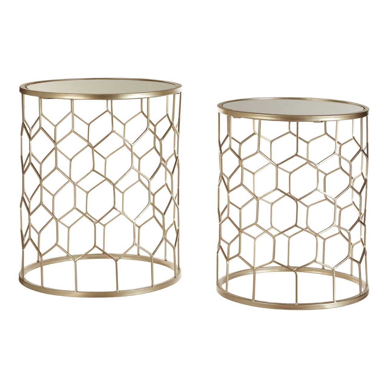 Elevate your living space with the Arcana Set Of Two Honeycomb Side Tables. These contemporary tables feature a champagne-finished metal frame with a chic honeycomb pattern, topped with sleek round mirrored glass. The perfect combination of style and functionality, these tables are sure to add a touch of modern elegance to your home decor.