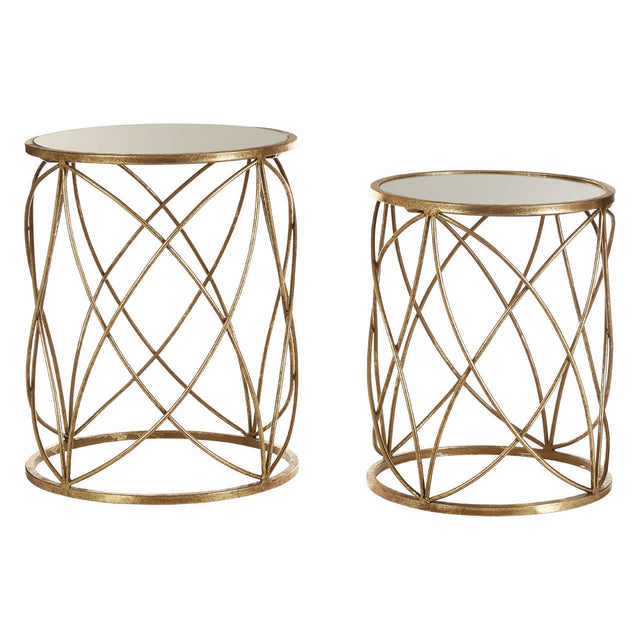 Elevate your living space with the Arcana Set of Two Round Side Tables. The unique design of these tables brings a touch of glamour to contemporary and modern interiors. Featuring a round mirrored glass top and an open-frame metal structure finished in gold, these tables display elegant curved intersecting lines that will add sophistication to any room. Perfect for showcasing decor or holding drinks, this set is a stylish and functional addition to your home.