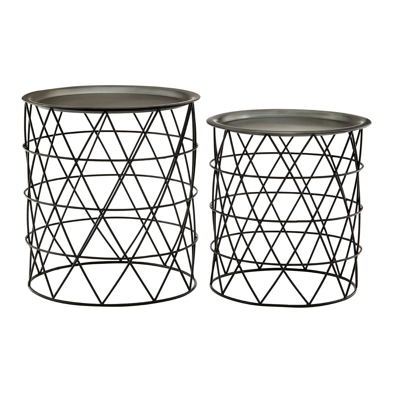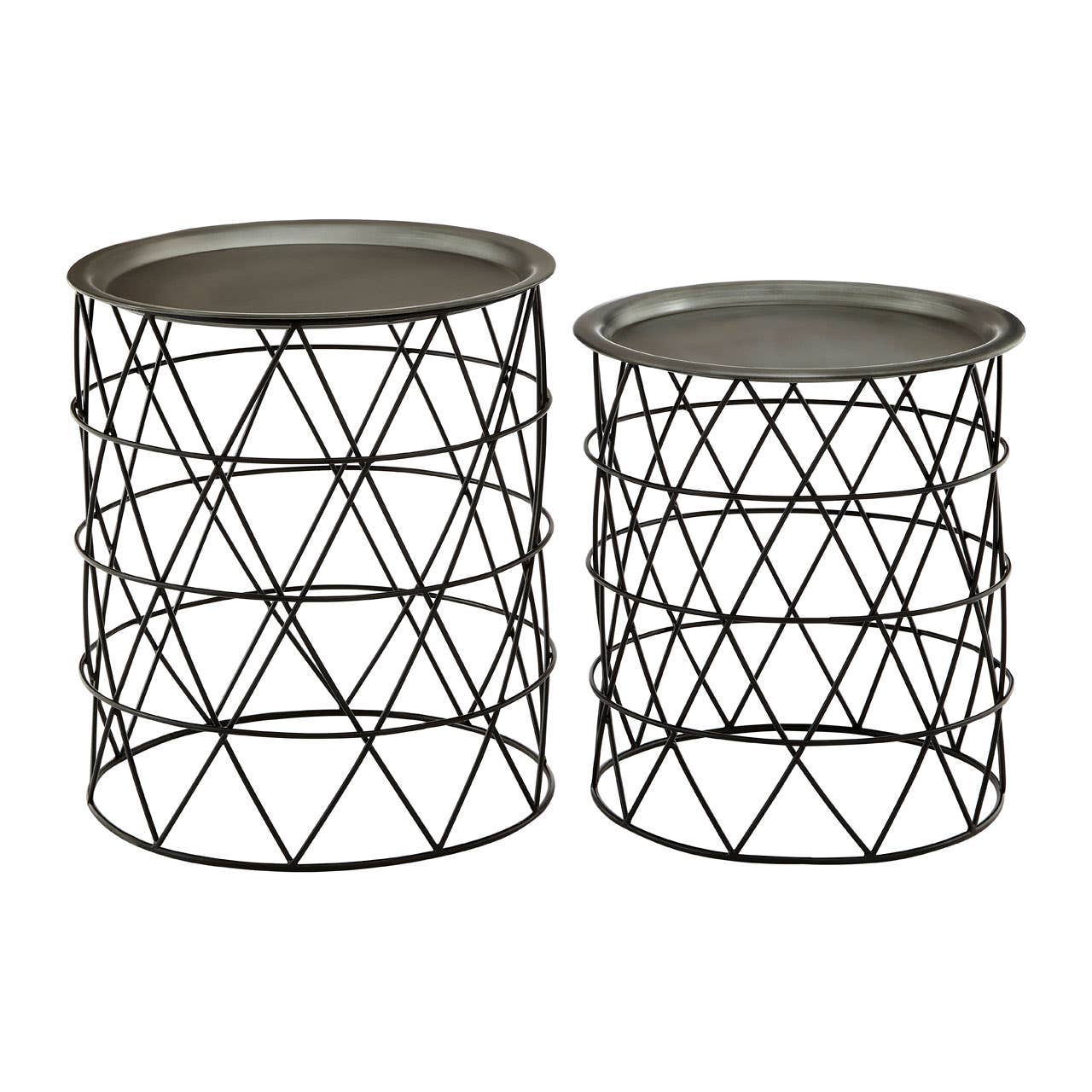 Elevate your decor with this set of two Zinc and Black Iron Tables. The recessed surface areas and rounded lips on each tabletop beautifully contrast the straight angles of the bases. The unique cylindrical iron bases, featuring triangular patterns, add a touch of modern elegance to any space. Pair them with wireframe lighting for a chic and contemporary look.