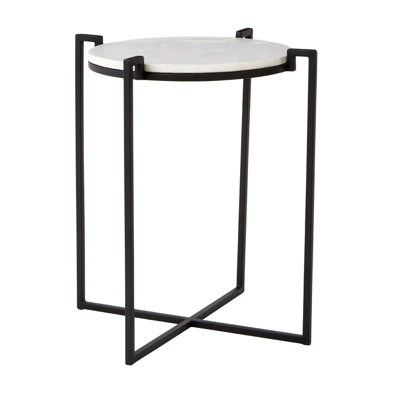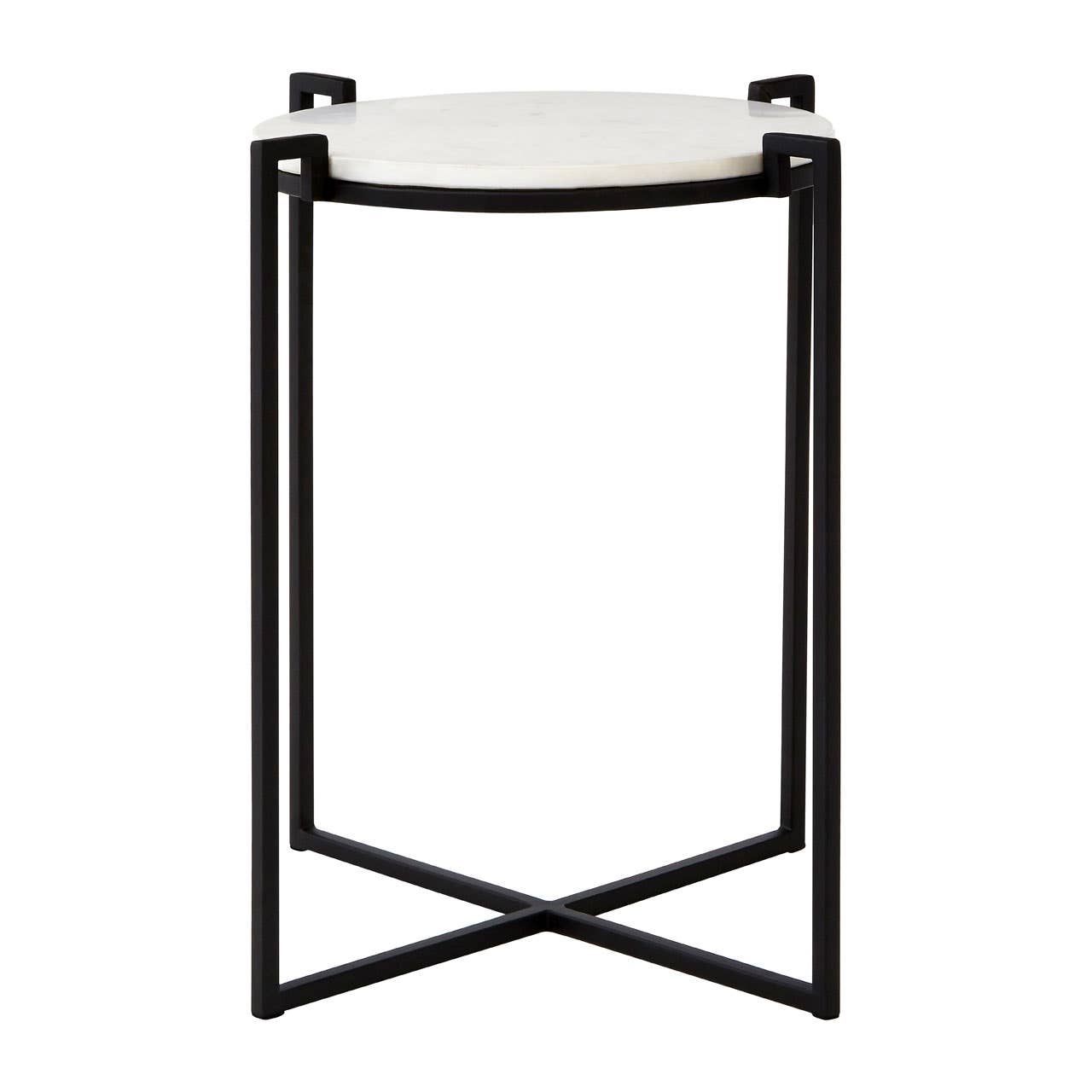 Crafted with a striking design, the Black Marble Iron Side Table is a modern addition to any living space. The contrast of the natural white marble top against the sleek black iron frame creates a contemporary look. This unique piece stands elegantly on four cross-legged iron supports, adding a touch of sophistication to your home decor. Elevate your interior with this stylish and functional side table.