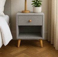 Introducing GIE's latest addition, the Roscommon bed. Upholstered in a stylish grey fabric, it features sturdy wooden feet and a charming button back detail. Complement your bedroom with the matching storage ottoman and bedside table.