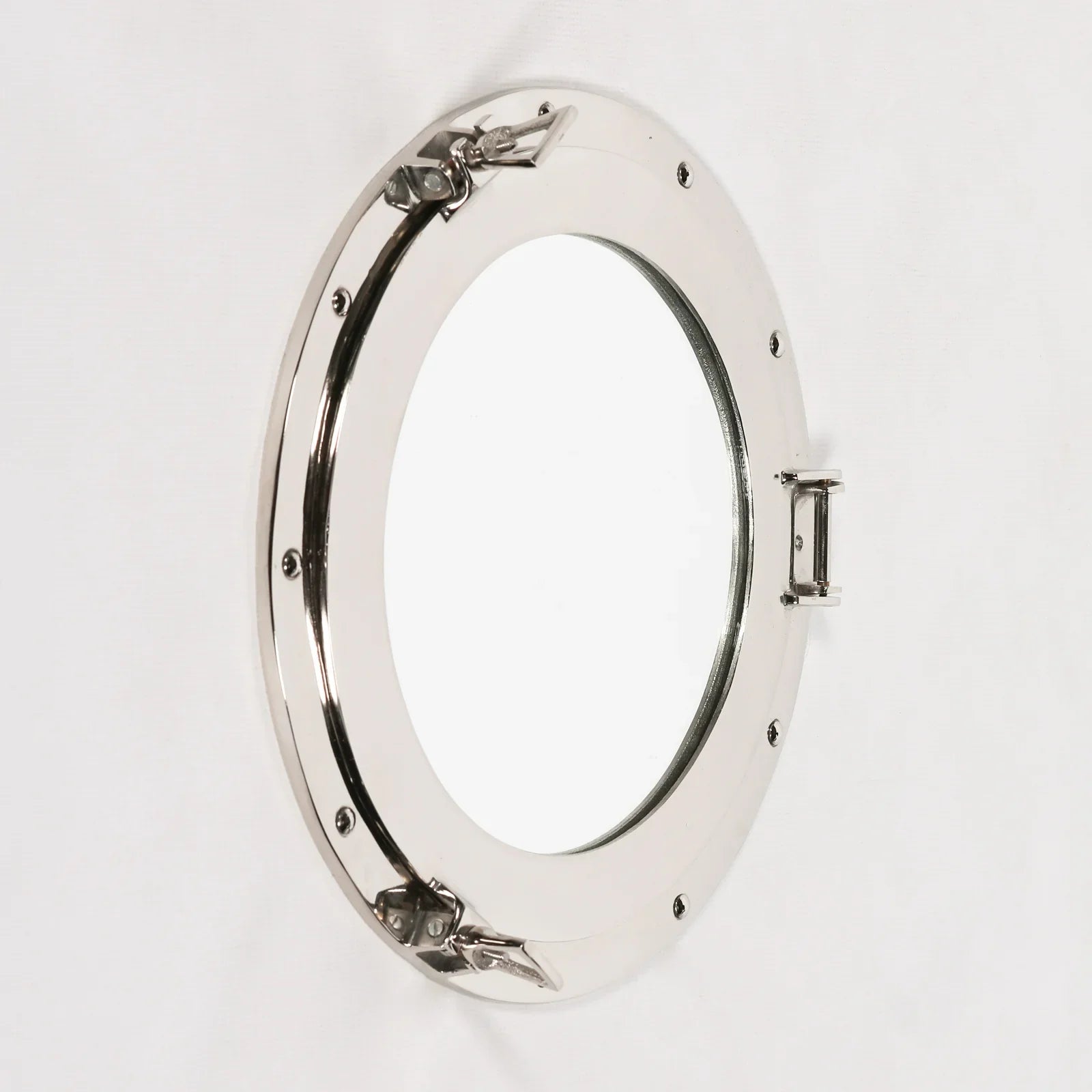 This large porthole style accent mirror is crafted from aluminium in a silver polished finish, featuring a distinctive detailed frame.