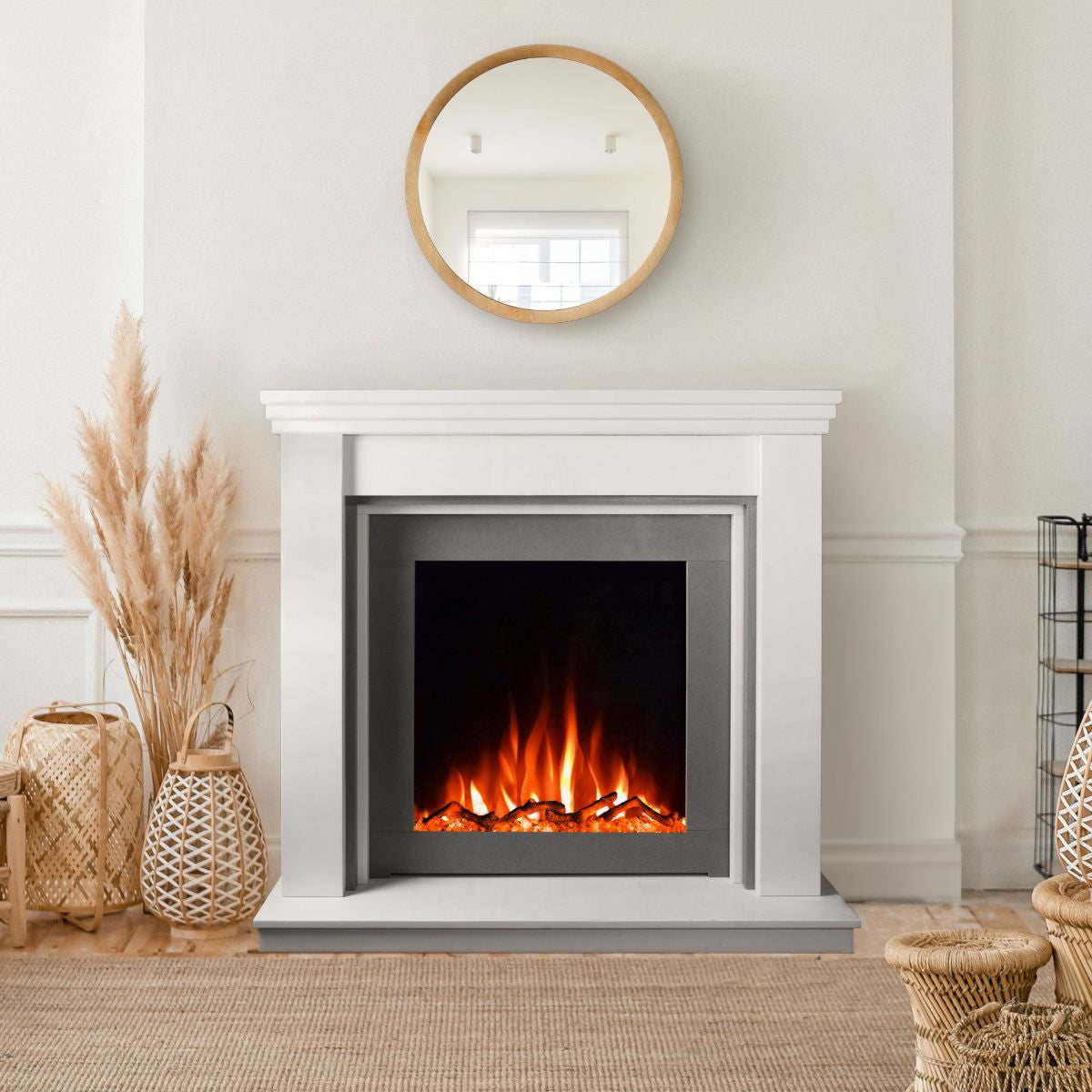 Enhance the ambiance of your living space with the 48 Antoinette Two-Tone Celestial 600 Electric Suite. This stunning suite features a combination of Honed Polar White and Luna Grey, complemented by a Polar White Hearth for a modern and elegant look.