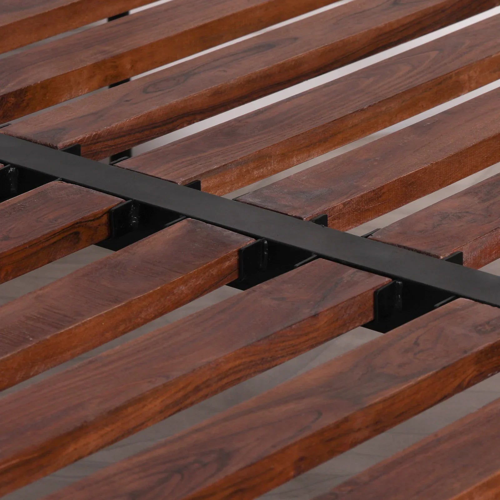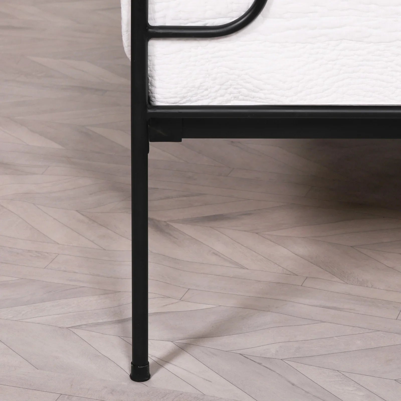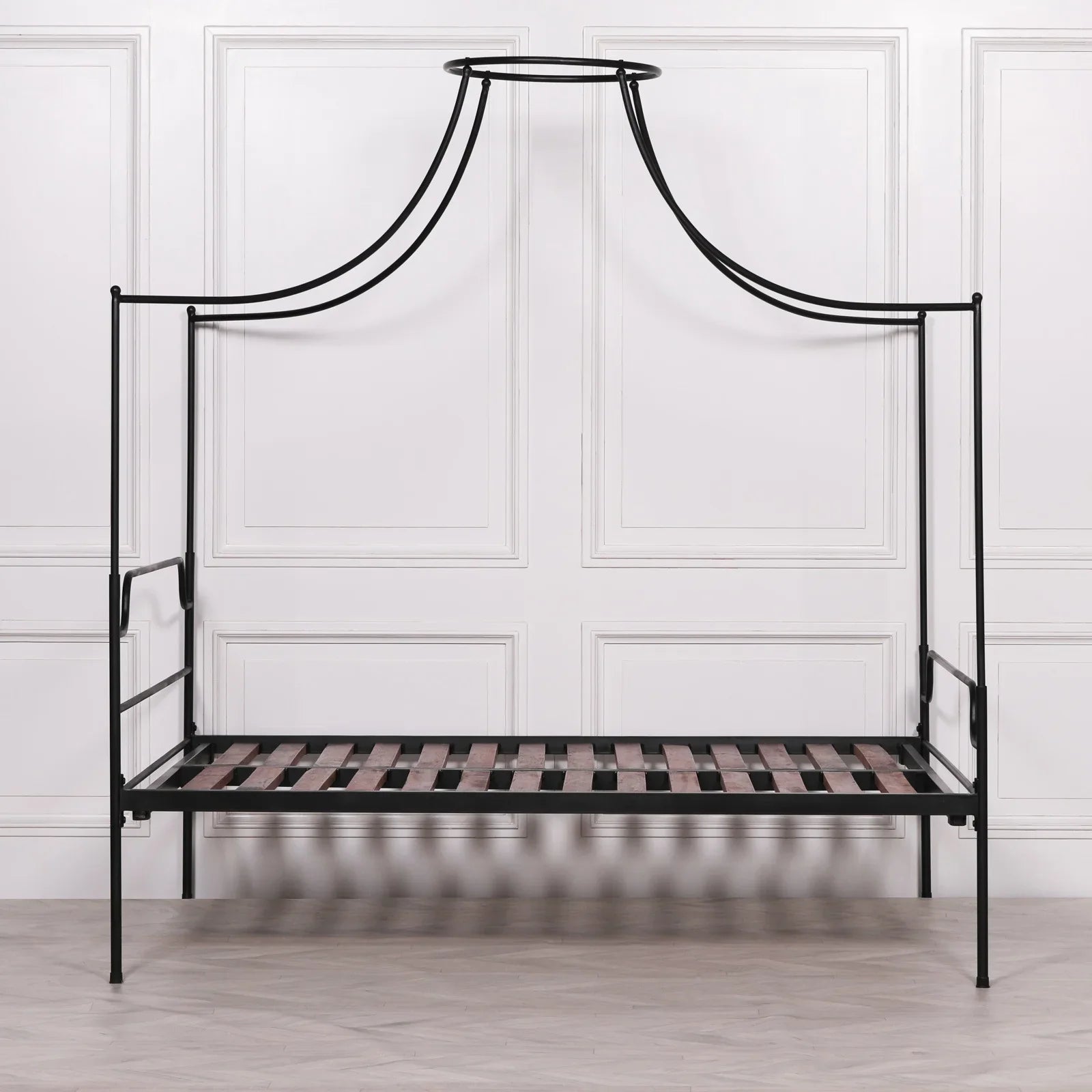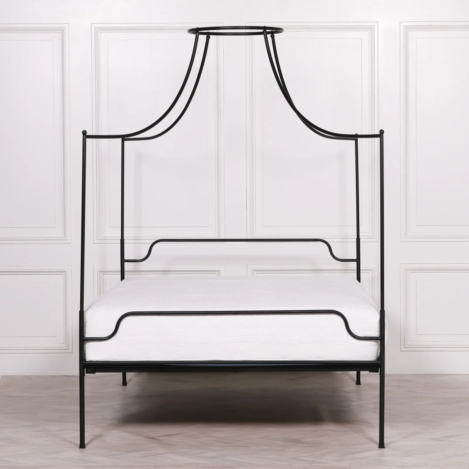 This Black Iron 4ft6 Double Size Poster Bed features a stunning four-poster design with black iron frames overhead. The bed is complemented by acacia wooden slats and a low headboard, creating a stylish and sophisticated look. Please note that the mattress is not included.