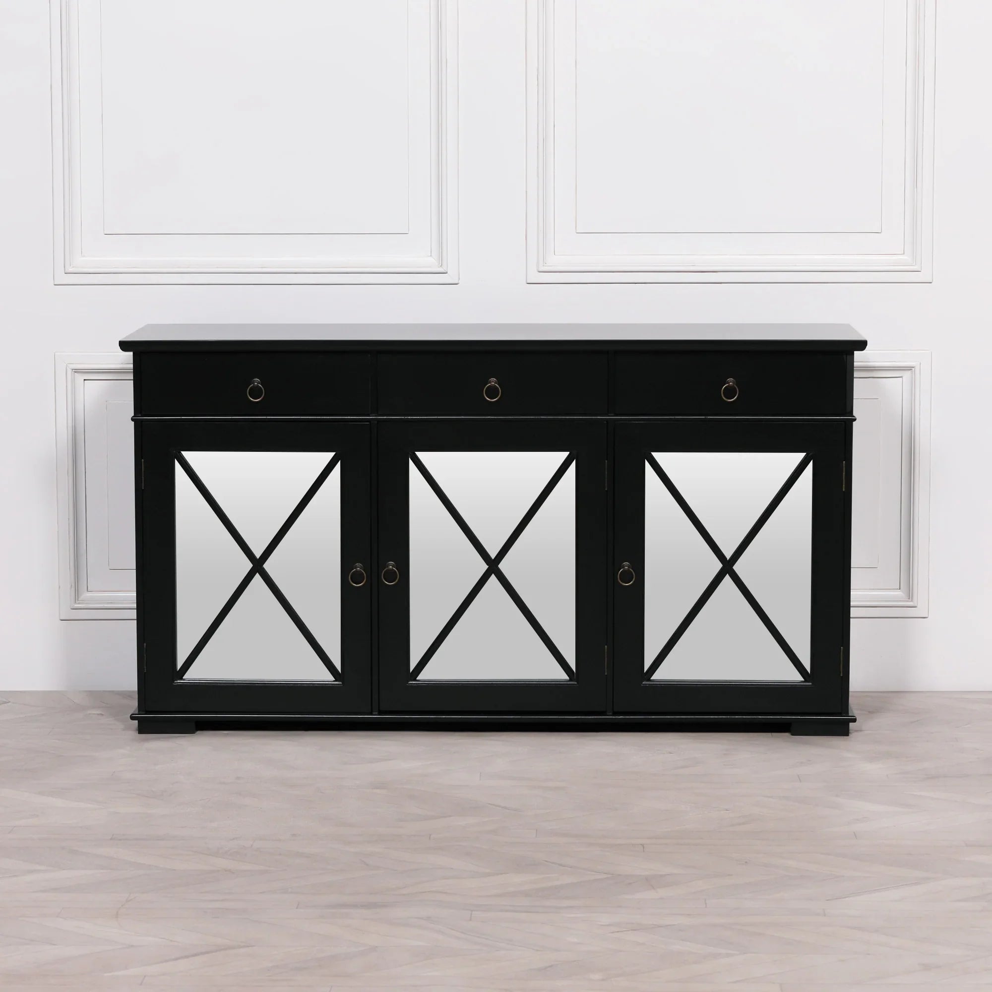 Enhance your living space with this elegant black Oriental sideboard featuring mirrored X-faced doors and three convenient drawers. Crafted from MDF and wood, this stylish piece is both functional and visually appealing.