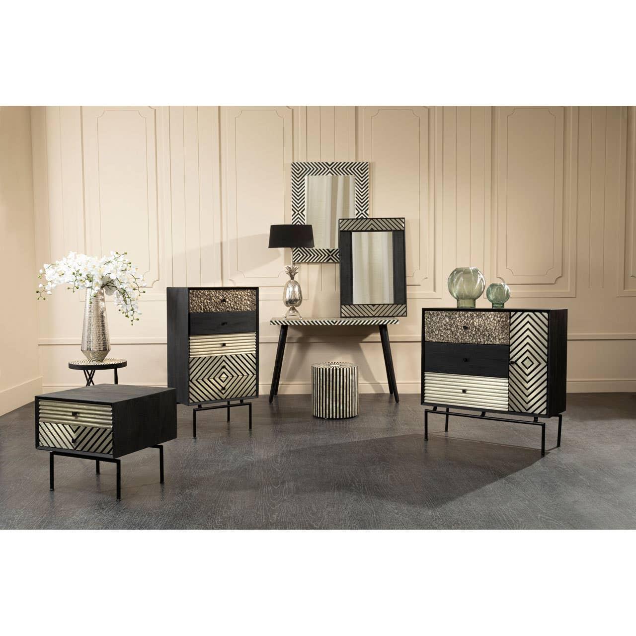 Elevate your living space with our Boho Striped Bone Inlay Table. Crafted with sustainable sheesham wood legs in a sleek black finish, this console table features a striking black and white striped pattern on its rectangular top. The perfect fusion of modern design and bohemian charm, this table adds a touch of contemporary flair to any room. Bring a unique and stylish aesthetic to your home with this eye-catching piece that is as functional as it is beautiful. Ideal for those who appreciate artisanal craftsmanship and distinctive decor.