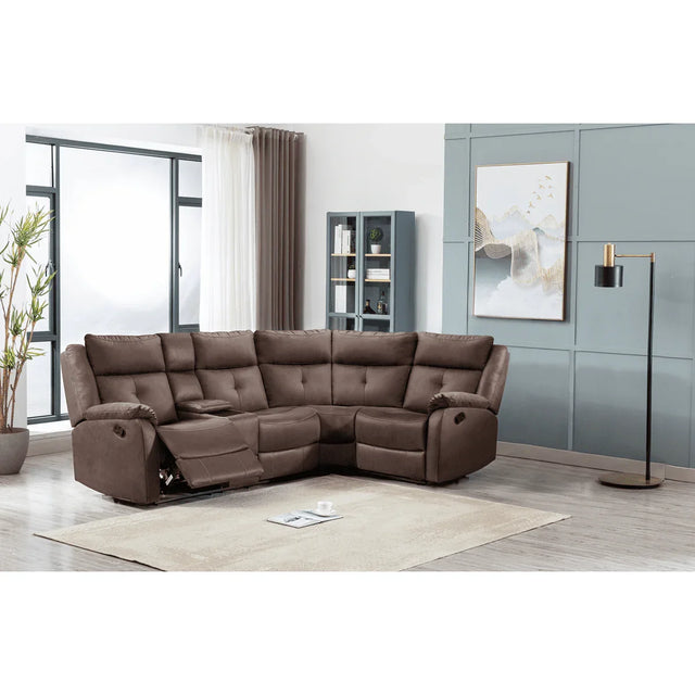The Casey Corner Chestnut combines comfort and style with its sleek design, button details, and reclining features. This corner sectional sofa is ideal for modern homes, offering both functionality and luxury.