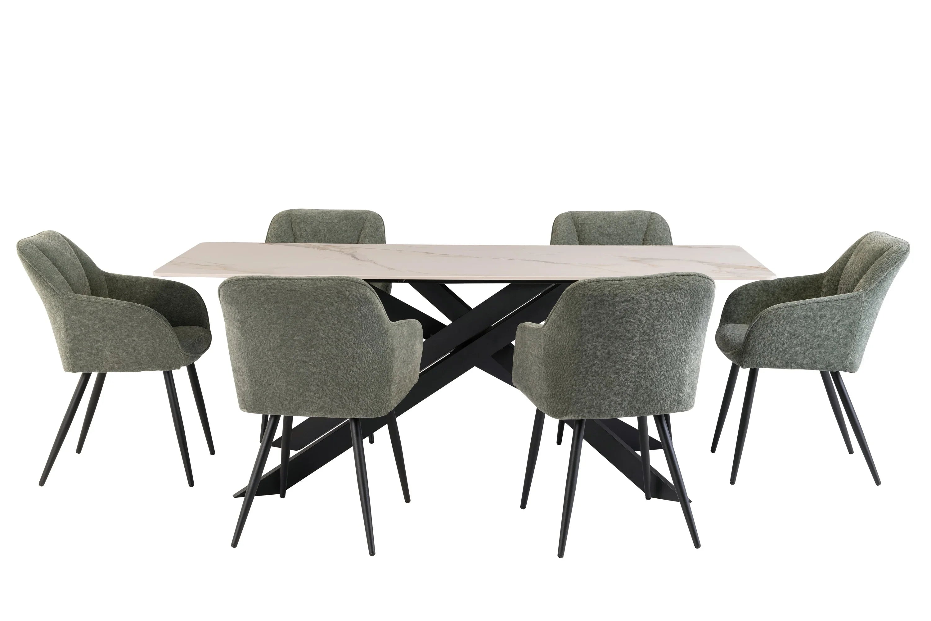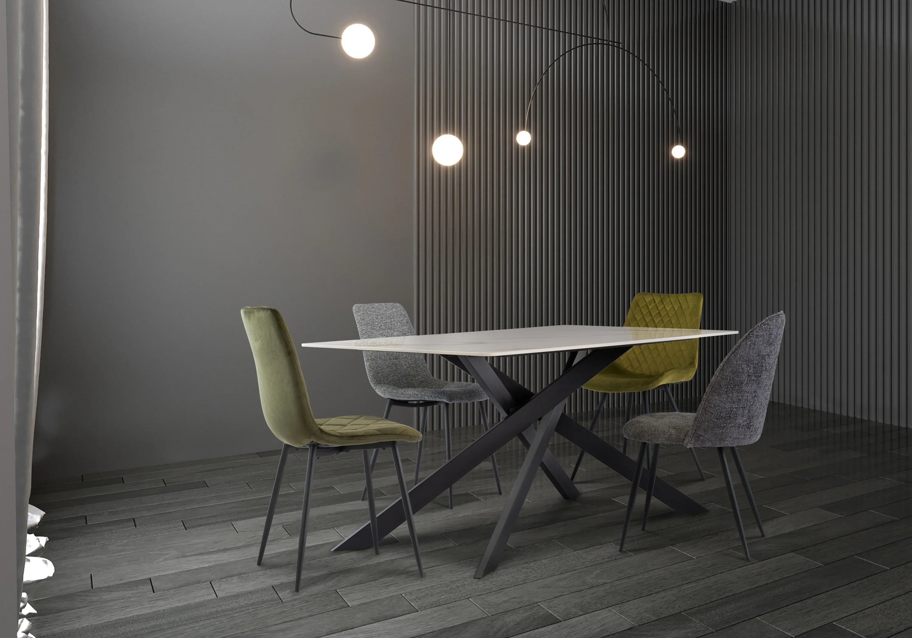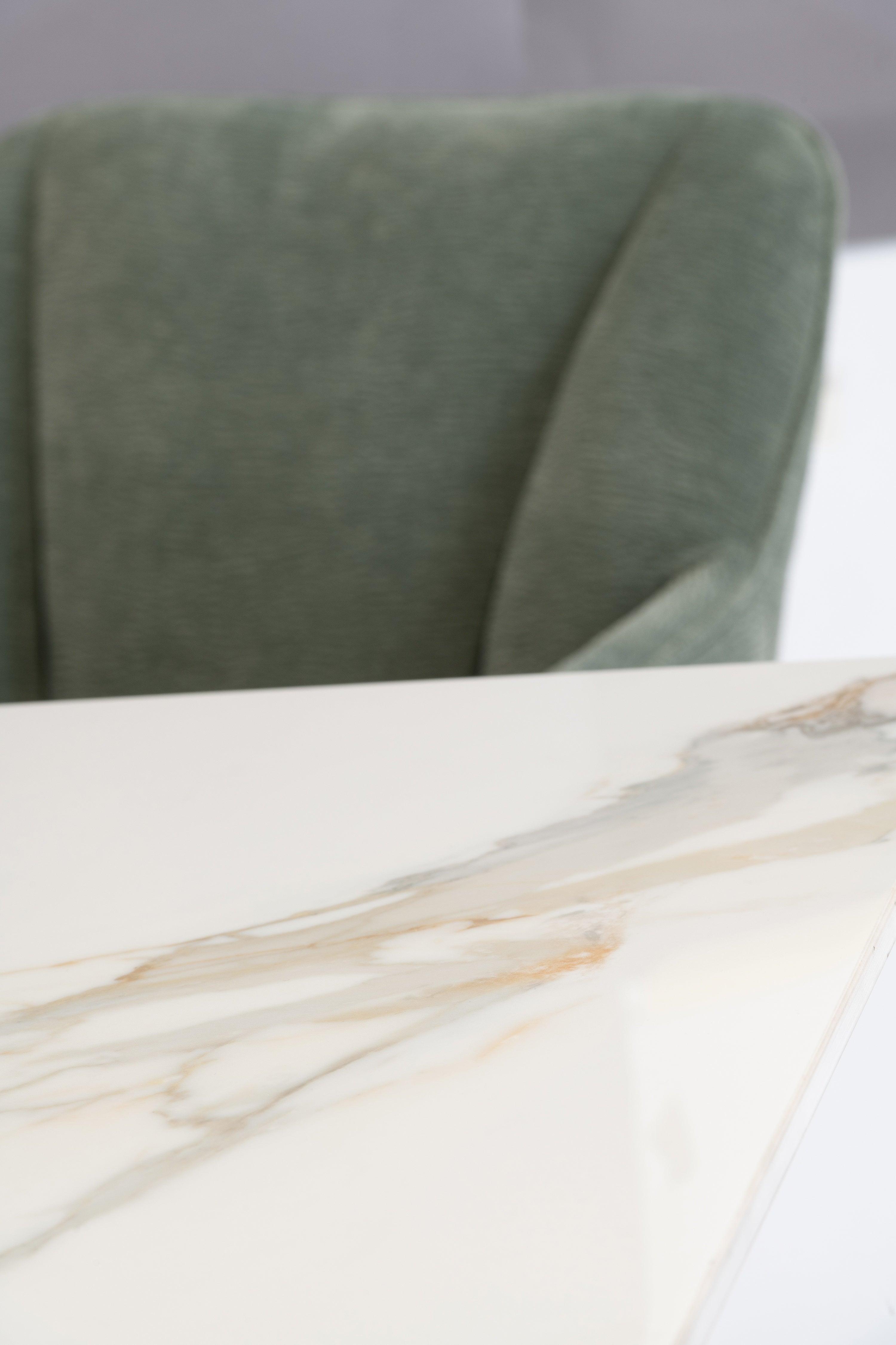 Elevate your dining experience with this stunning modern dining table, designed to impress and inspire. The exquisite white sintered stone top, featuring striking gold and grey veining with sophisticated green undertones, creates a luxurious focal point in any dining space. Its sleek and ultra-contemporary black powder-coated stainless steel base not only adds stability but also enhances the overall aesthetic, making it a perfect addition to both formal and casual settings.