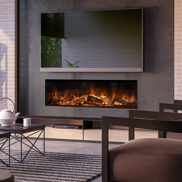 Introducing the Evonic E-lectra 1500 Glass Fronted Fire, the largest built-in fire in the e-lectra range by Evonic. With a generous flame width of 1500mm, this fire is ideal for integrating into a media wall alongside a television up to 65". Experience the stunning 1500mm flame picture with 13 colour options, British woodland logs, and anti-reflective SCHOTT Clear Float front glass.