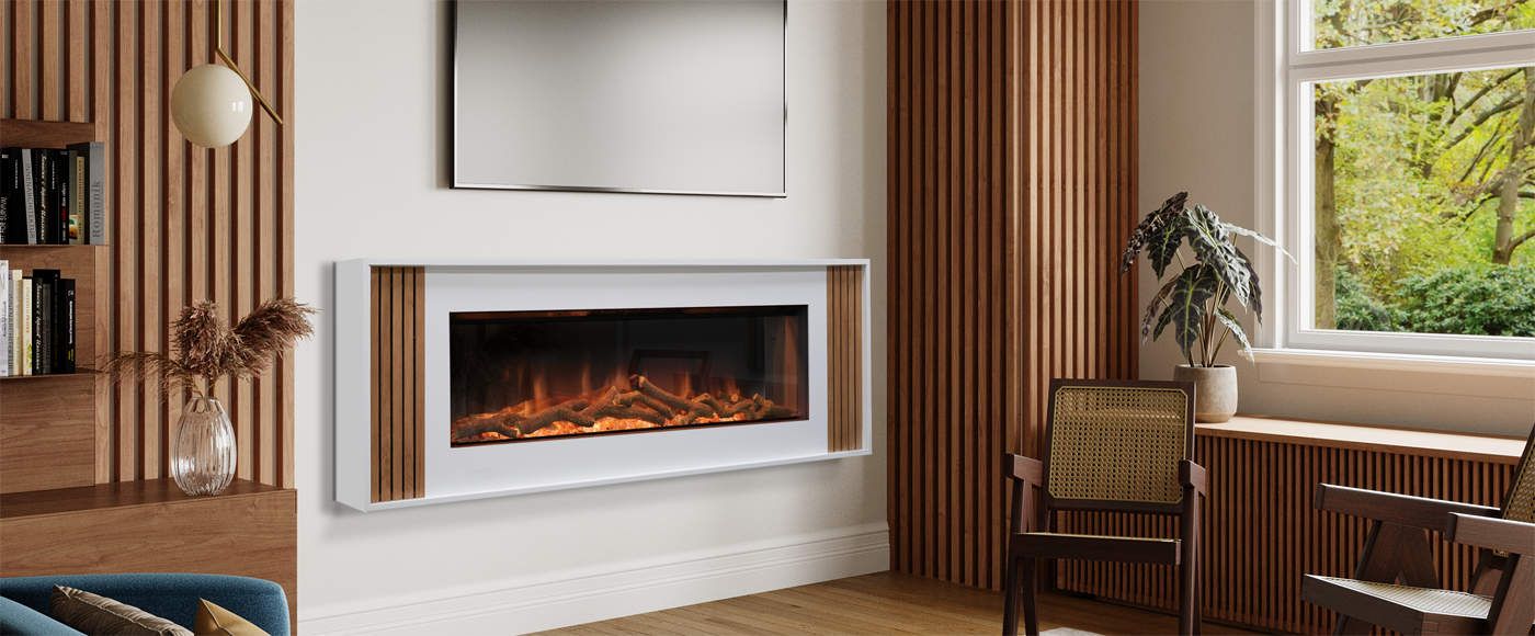 The Evonic Rivera 200 Suite combines a sleek white modern design with oak side slats and a generous flame effect width of 1500mm. With dual animation effects and the option to activate the heat output, this fireplace will add both style and warmth to your home.