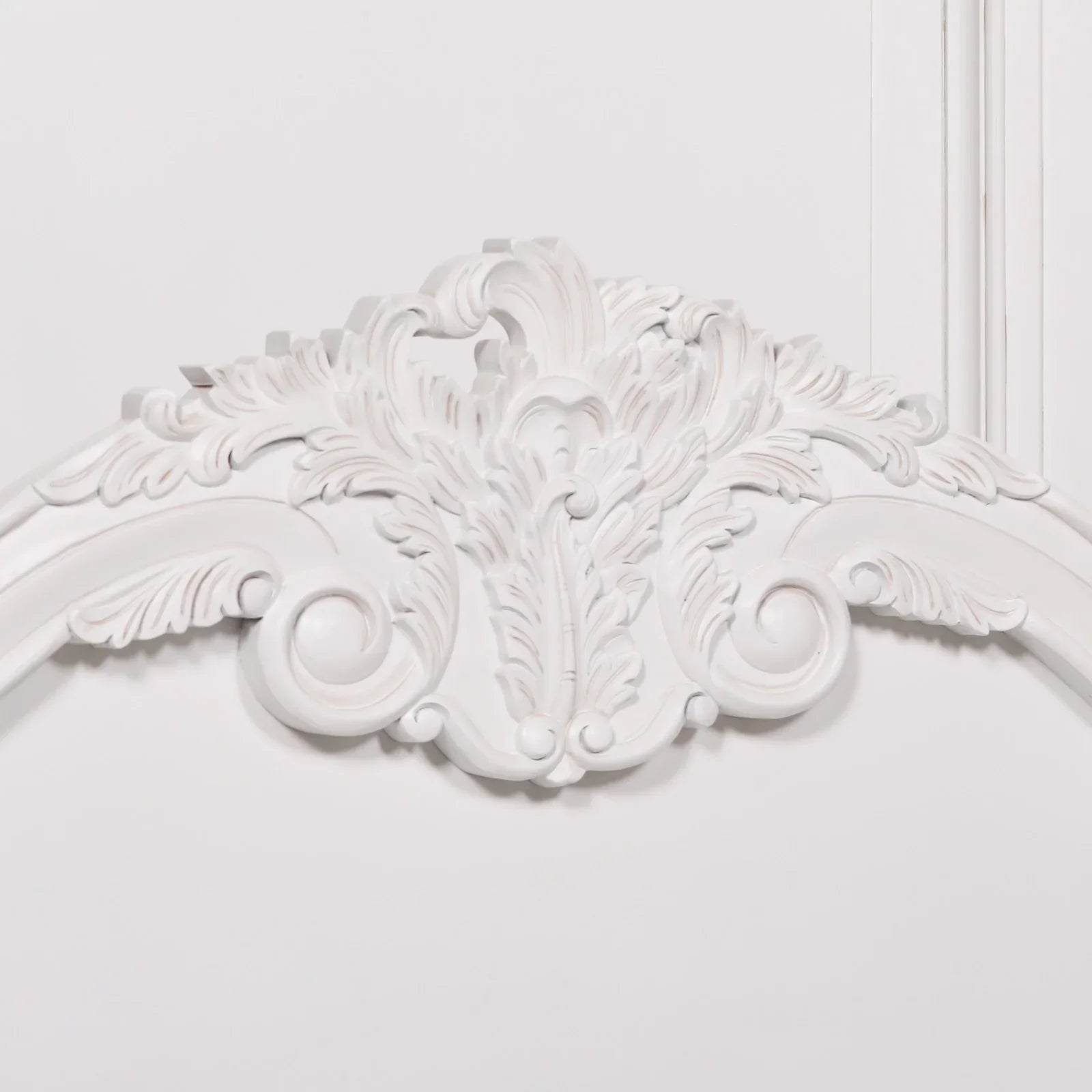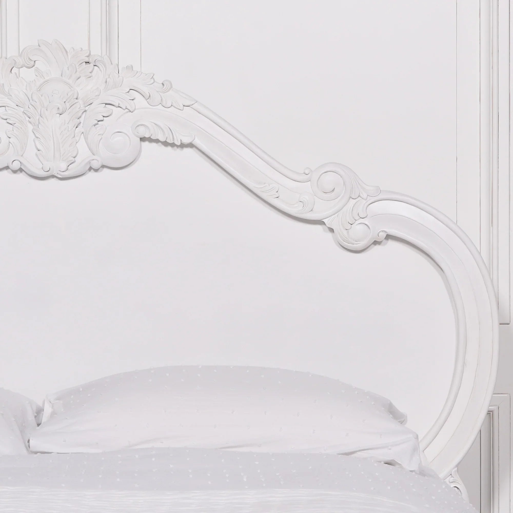 This French Carved Rose Cherub Double Size 4ft6 Bed features an elegant white finish and intricate wooden hand carved details, crafted from mahogany wood in a classic French style.
