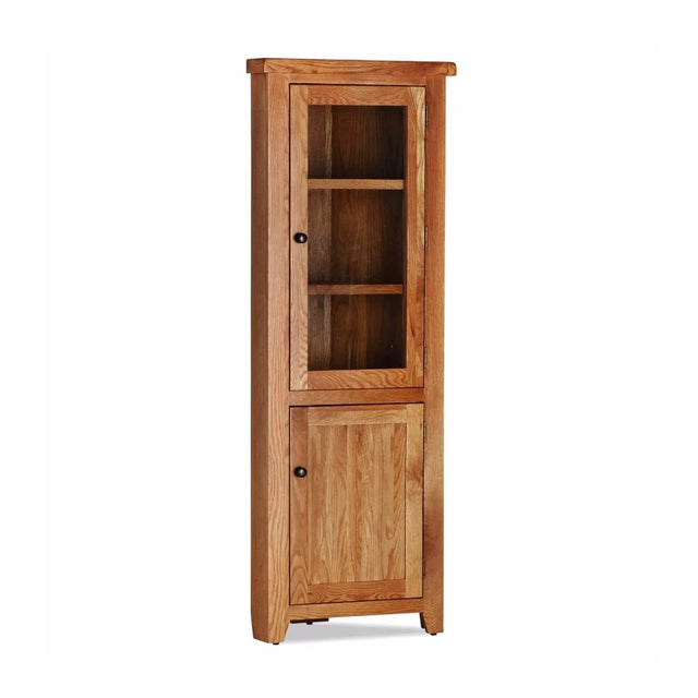 Display your cherished items with the Oscar Corner Display High from our classic Oscar Dining & Occasional Range. Crafted from solid oak with a semi-gloss lacquer seal, this display unit features rounded oak corners and tongue and groove joints, offering both style and functionality.